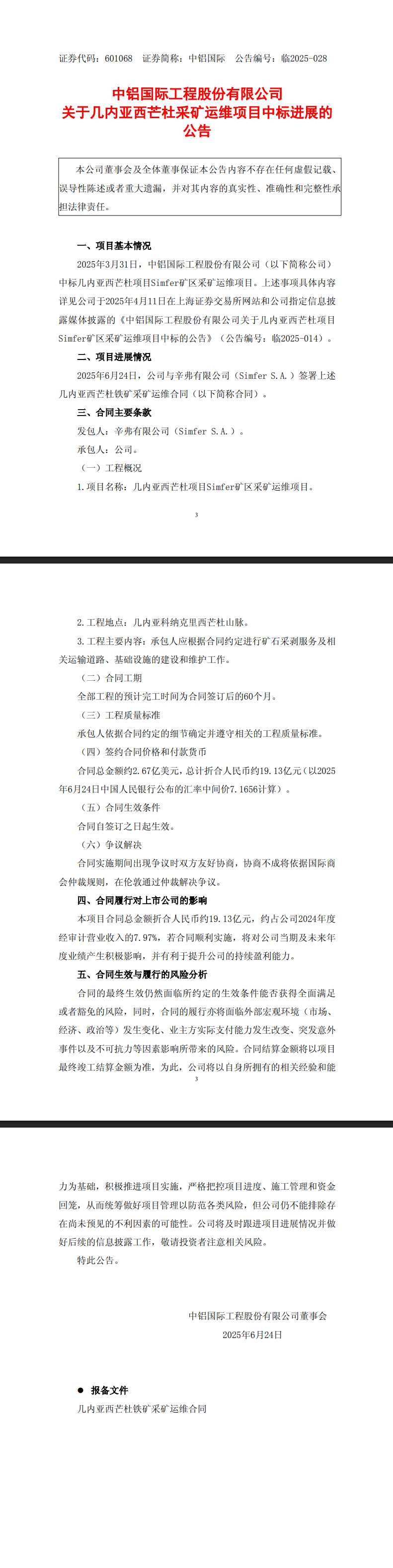 發包方為辛弗有限公司(Simfer S.A.),承包方為公司。項目名稱為幾內亞西芒杜項目Simfer礦區采礦運維項目,工程地點位于幾內亞科納克里西芒杜山脈,主要內容包括礦石采剝服務及相關運輸道路、基礎設施的建設和維護。合同工期為簽訂后60個月,工程質量標準按合同約定執行。簽約合同總金額約2.67億美元,折合人民幣約19.13億元(以2025年6月24日中國人民銀行公布的匯率中間價7.1656計算),合同自簽訂之日起生效。爭議解決方式為友好協商,協商不成則依據國際商會仲裁規則在倫敦仲裁。
