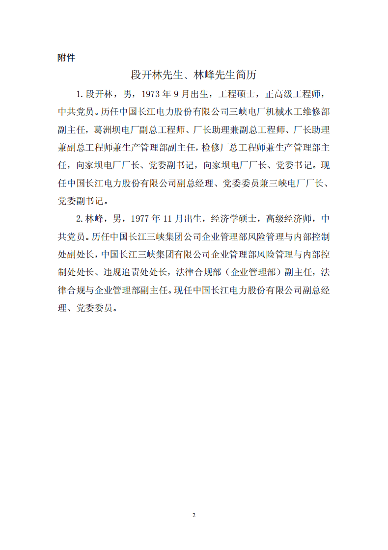 8月29日,長(zhǎng)江電力發(fā)布公告稱,8月28日,長(zhǎng)江電力第六屆董事會(huì)第四十六次會(huì)議,審議通過(guò)《關(guān)于調(diào)整公司副總經(jīng)理的議案》,同意聘任段開(kāi)林先生、林峰先生為公司副總經(jīng)理。因工作調(diào)動(dòng),謝俊先生、冉毅川先生不再擔(dān)任公司副總經(jīng)理,其中謝俊先生不繼續(xù)在公司任職,冉毅川先生改任公司首席專業(yè)師。截至本公告日,謝俊先生、冉毅川先生未持有公司股票,不存在未履行完畢的公開(kāi)承諾。