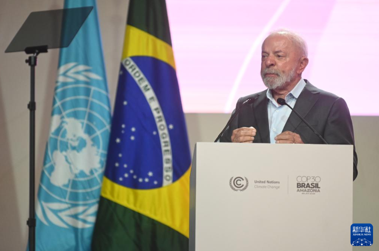 11月10日,巴西總統盧拉在巴西北部城市貝倫舉行的《聯合國氣候變化框架公約》第三十次締約方大會(COP30)開幕式上發表講話。新華社發(盧西奧·塔沃拉 攝)