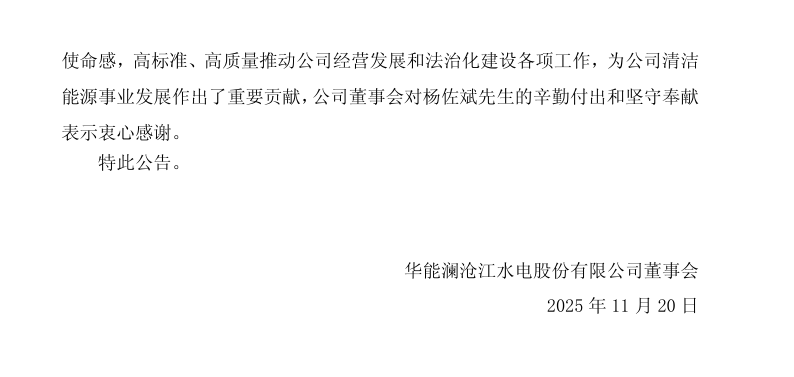 楊佐斌辭去華能瀾滄江水電股份有限公司副總經理等職務。