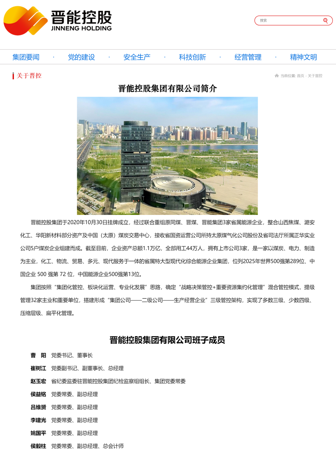 據官網信息顯示,晉能控股集團于2020年10月30日掛牌成立,經過聯合重組原同煤、晉煤、晉能集團3家省屬能源企業,整合山西焦煤、潞安化工、華陽新材料部分資產及中國(太原)煤炭交易中心,接收省國資運營公司所持太原煤氣化公司股份及省司法廳所屬正華實業公司5戶煤炭企業組建而成。截至目前,企業資產總額1.1萬億,擁有上市公司3家,是一家以煤炭、電力、制造為主業,化工、物流、貿易、多元、現代服務于一體的省屬特大型現代化綜合能源企業集團,位列2025年世界500強第289位、中國企業500強第72位,中國能源企業500強第13位。