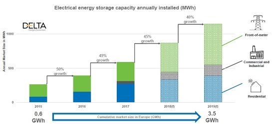 分析師稱,歐??洲2017年電力儲存裝置基數(shù)增長了近50%,但可能更大的收獲是安裝在電表后面的電池系統(tǒng)的份額越來越大。