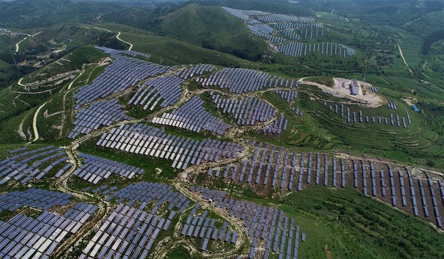 8月11日,國網(wǎng)玉田縣供電公司的工人在石嶺口光伏發(fā)電場巡查并網(wǎng)線路(無人機(jī)拍攝)。