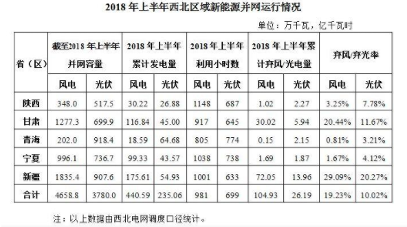 2018年上半年,西北五省(區)新增風電并網容量100萬千瓦,累計并網容量4658.8萬千瓦,占全網總裝機的19.02%;風電發電量440.59億千瓦時,占全網總發電量的11.87%;平均利用小時數981小時,棄風電量104.93億千瓦時,棄風率19.23%。西北五省(區)棄風率依次為:陜西3.25%、甘肅20.44%、青海0.81%、寧夏1.67%、新疆29.09%。