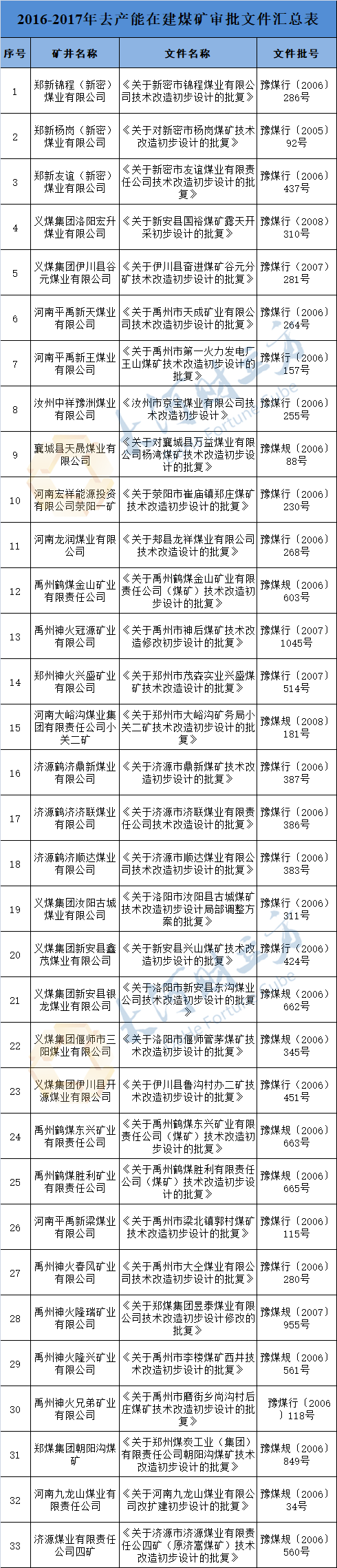 附:2016-2017年去產能在建煤礦審批文件匯總表