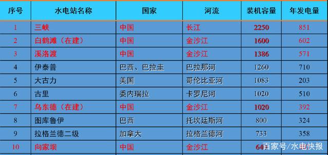 此外還有烏東德電站裝機1020萬千瓦,排在第7;向家壩電站裝機容量640萬千瓦,排在第10。榜單的前三名,均被我國占據(jù),足見我國水電建設(shè)的成就和實力,真是厲害了,我的國!