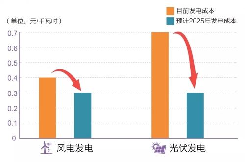 特高壓具有網絡規模效應,成網后將顯著降低電力供應成本。目前我國風電、光伏發電成本分別為0.4元/千瓦時、0.7元/千瓦時左右,預計2025年均可降至0.3元/千瓦時左右。