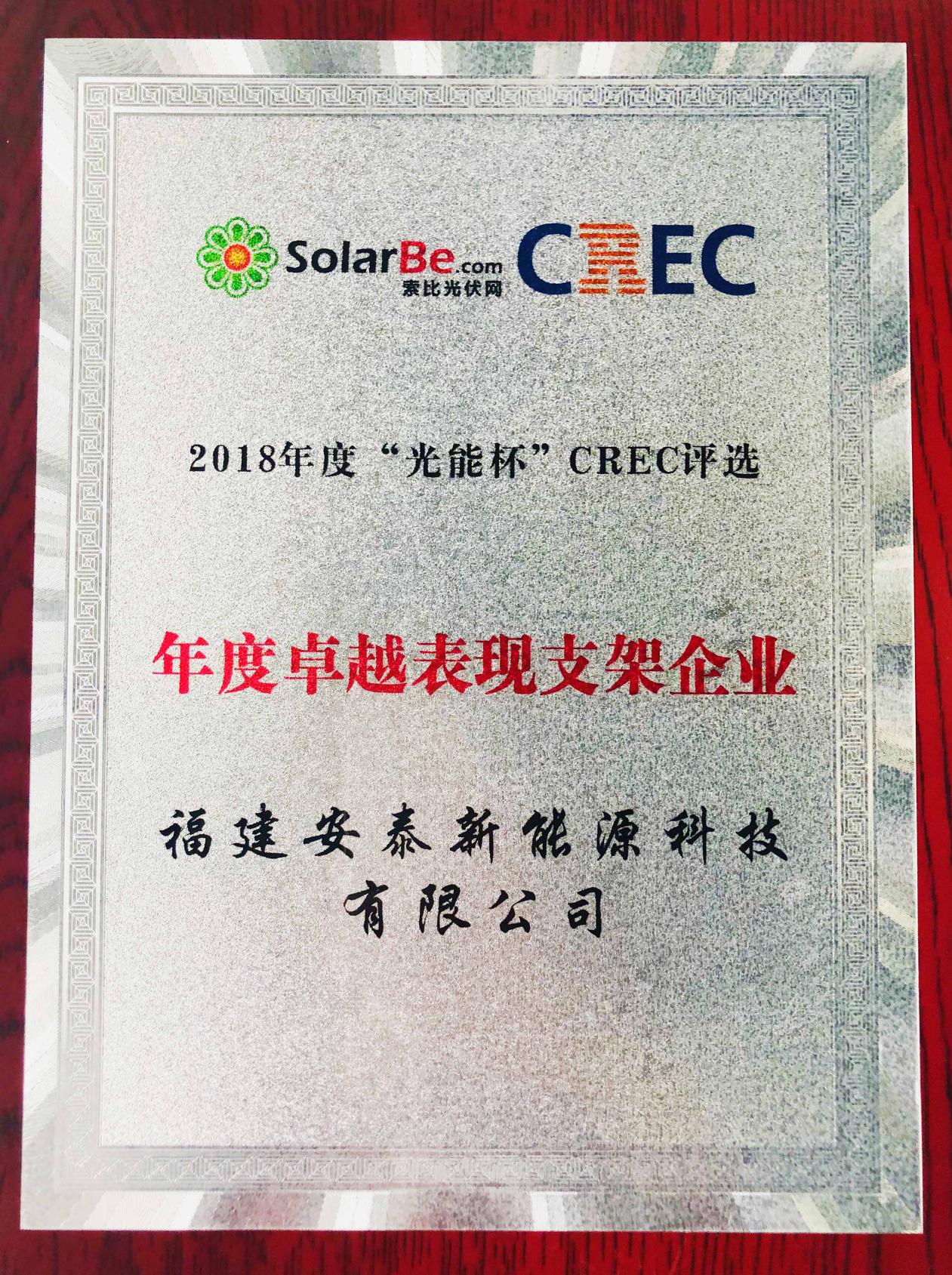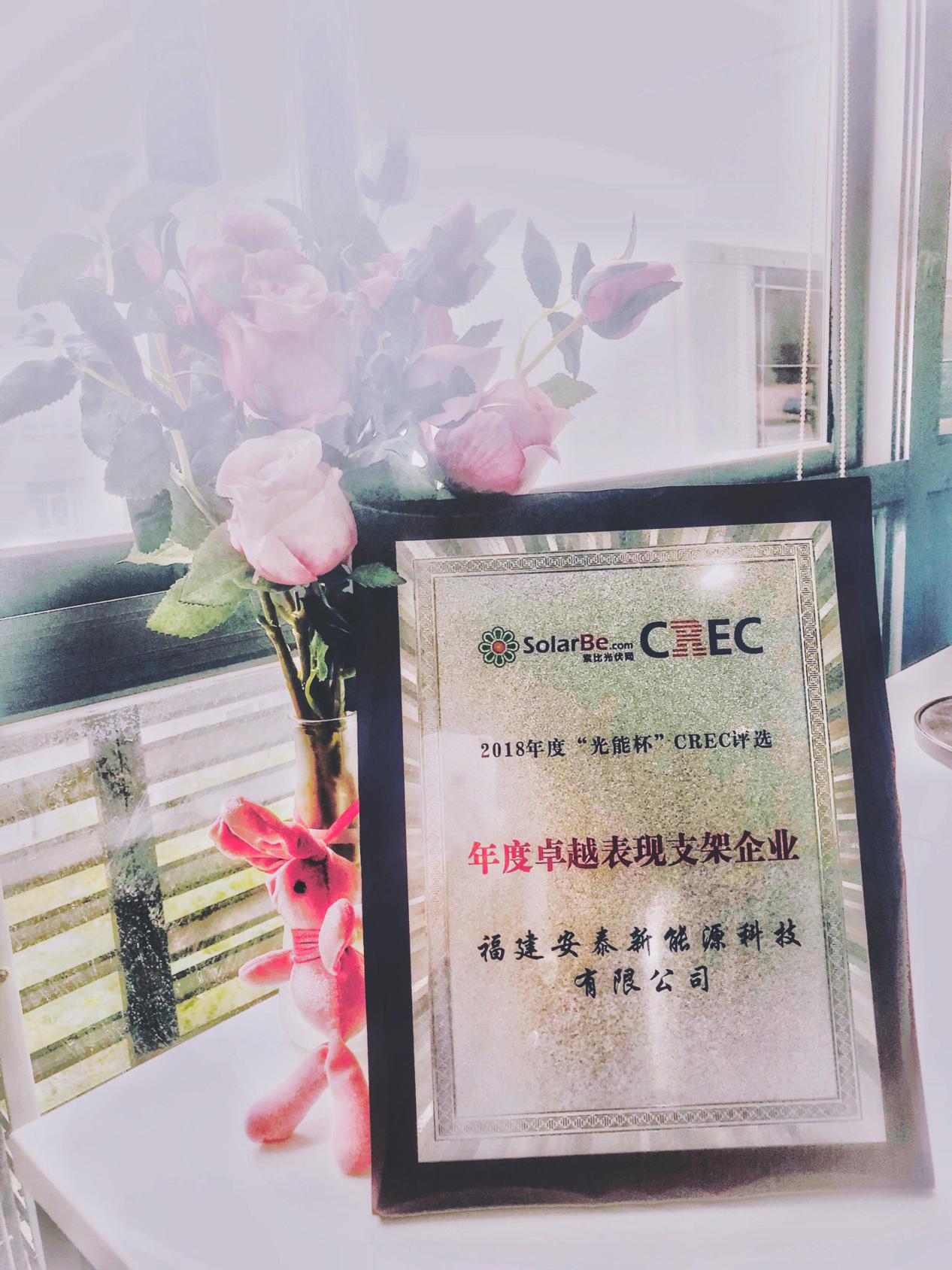 2018年“光能杯”CREC光伏行業評選頒獎盛典于10月31日晚在無錫正式拉開帷幕,作為國內領先的光伏支架企業,憑借優秀的市場口碑以及項目實績,福建安泰新能源科技有限公司成功斬獲“年度卓越表現支架企業”大獎。