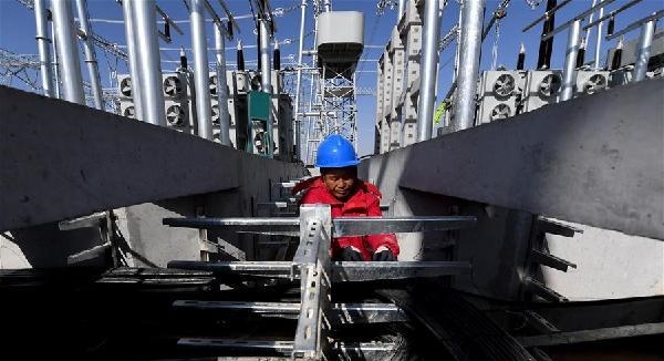 ↑11月6日,國家電網陜西省電力公司的工作人員在陜北風電基地750千伏集中送出工程定靖750千伏變電站進行斷路器安裝。 新華社記者劉瀟攝