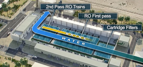 最后再用兩段式反滲透來去除海水中的溶解性雜質和鹽,這套設備還有能量回收系統。