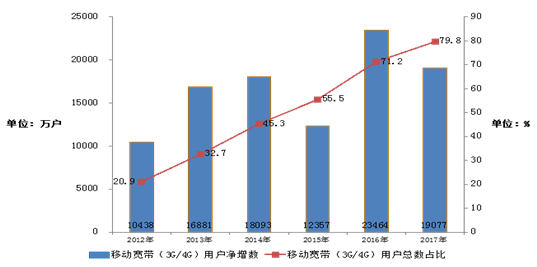 2012-2017年移動寬帶用戶(3G/4G)發展情況