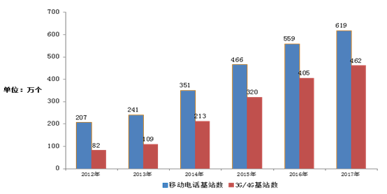 2012-2017年移動電話基站發展情況