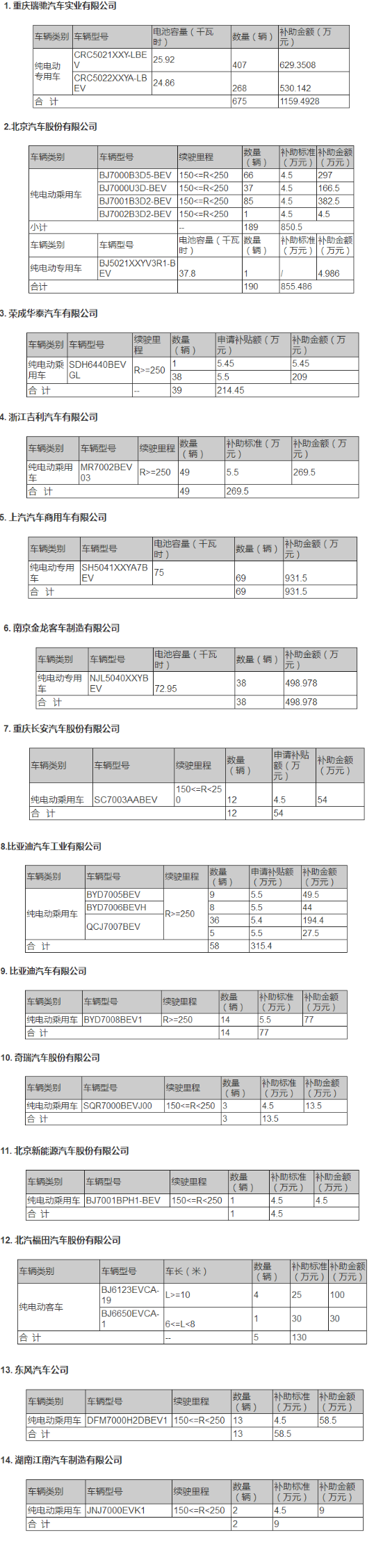 其中,重慶瑞馳汽車將獲得1159.5萬元,北汽將獲得855.5萬元,華泰汽車將獲得214.5萬元,吉利汽車將獲得269.5萬元,上汽商用車將獲得931.5萬元,南京京龍將獲得499萬元,重慶長安汽車將獲得54萬元,比亞迪工業汽車將獲得315.4萬元,比亞迪汽車將獲得77萬元,奇瑞汽車將獲得13.5萬元,北汽新能源將獲得4.5萬元,北汽福田將獲得130萬元,東風汽車將獲得58.5萬元,江南汽車將獲得9萬元。