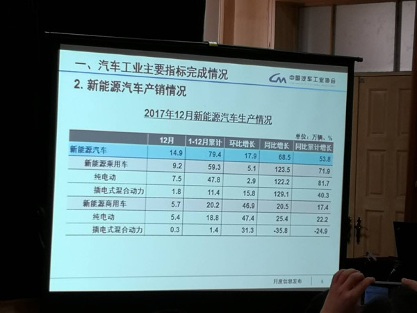 2018年1月11日,中國汽車工業協會召開2017年度12月份汽車產銷數據發布會。在新能源汽車部分,12月份產銷量分別為14.9萬輛和16.3萬輛 ,同比增長分別為68.5%和56.8%;2017年全年累計產銷分別為79.4萬輛和77.7萬輛 ,同比增長分別為53.8%和53.3%。
