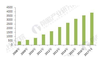 圖表1:2008-2017年中國節能服務產業產值規模變化情況(單位:億元)