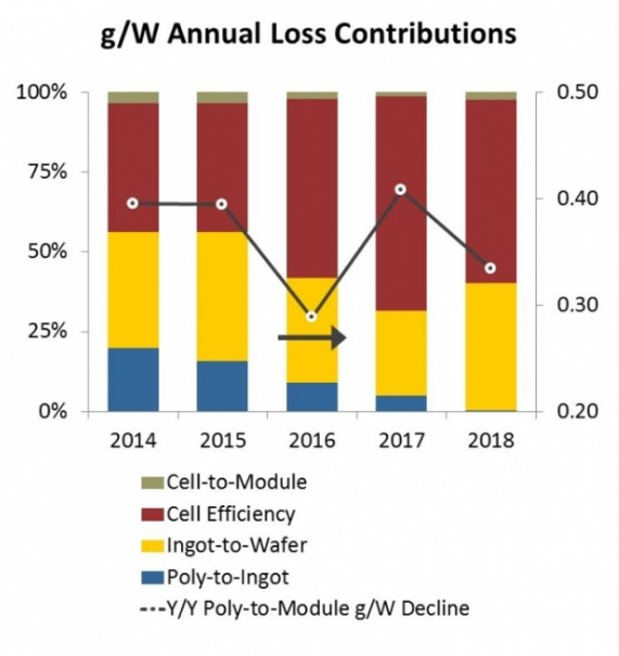 主要有兩種因素促成了多晶硅g/ W消耗量的下跌:金剛線切割和電池效率的提高(更多的使用單晶,尤其是PERC技術)。到2018年年底,幾乎所有的硅片生產(單晶和多晶)都會使用金剛線,幾乎所有的單晶產品都會使用PERC技術,而多晶產品將會經歷自身PERC技術升級的階段。這些變化令其他階段發生的漸進式改進(鑄錠/拉錠、電池-組件損失和硅片厚度減少)相形見絀。