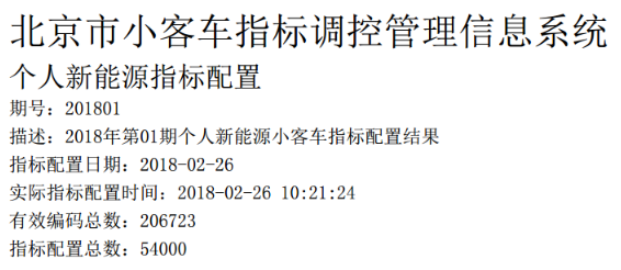 2月26日,北京市小客車指標辦發布2018年第1期個人和單位示范應用新能源小客車指標配置結果。本期有54000人獲得個人新能源汽車指標,3000人獲得單位新能源汽車指標。