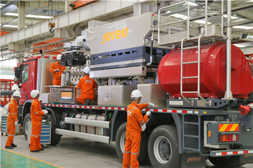 壓裂車是專門開采頁巖氣的高端油氣設(shè)備,杰瑞自主研發(fā)的“阿波羅一號”渦輪壓裂車,搭載了用于直升機的5600馬力的渦輪發(fā)動機,可以在游艇上使用的高速減速箱,全球油田領(lǐng)域水馬力最大的柱塞泵,將清潔能源頁巖氣開采效率整整提高一倍。