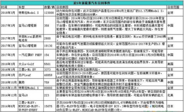 統計顯示,自2014年1月-2018年4月,特斯拉Model S有3次召回,合計召回數量高達24.2萬輛;寶馬i3增程版召回19130輛,日產Leaf召回46859輛,其他如大眾e-Golf、騰勢、一汽紅旗H7 PHEV、豐田Mirai氫燃料電池車、三菱i-Mi EV等也都涉及召回事件。