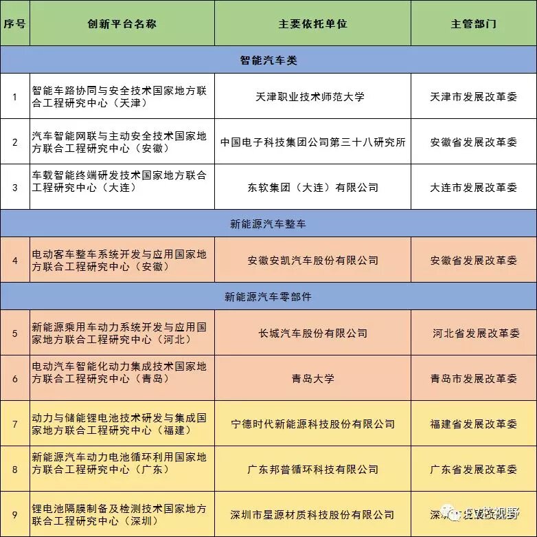 發(fā)改委批準(zhǔn)同意建設(shè)智能網(wǎng)聯(lián)汽車類研究中心3個(gè),新能源汽車整車類研究中心1個(gè),新能源汽車動(dòng)力系統(tǒng)類研究中心2個(gè),新能源汽車動(dòng)力電池類研究中心3個(gè)。研究中心主要依托單位有乘用車/客車整車企業(yè)長(zhǎng)城汽車、安凱汽車,有動(dòng)力電池龍頭寧德時(shí)代,動(dòng)力電池回收利用類邦普等。